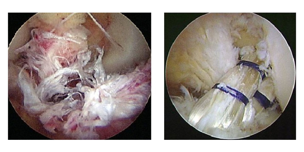 膝関節靱帯損傷の中ではスポーツ活動に伴う前十字靱帯損傷(ぜんじゅうじじんたいそんしょう (疾患編2参照))の頻度が最も高く、手術的な治療が必要となります。この場合、関節鏡(かんせつきょう)を用いて靱帯を作り直す鏡視下靱帯再建術という方法が行われます(図)。通常、膝の前(膝蓋腱)か後(ハムストリング腱)から腱の一部を採取し、内視鏡下に靱帯を作り直し(再建し)ます。この手術では、元の位置に正確に靱帯を再建することが重要となります。正しく行われた再建術では良好な関節安定性が得られ、スポーツ復帰も可能となります。
