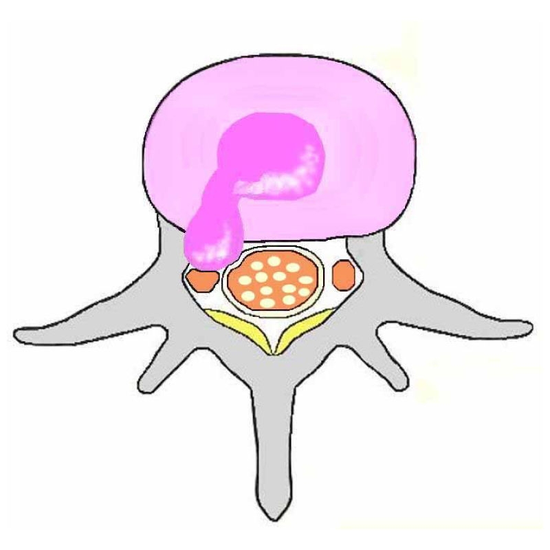 いくつかの原因が重なって起こるものと考えられています。直接的には線維輪の亀裂が起こり、その部位から髄核組織が脱出したものが椎間板ヘルニアといえます。